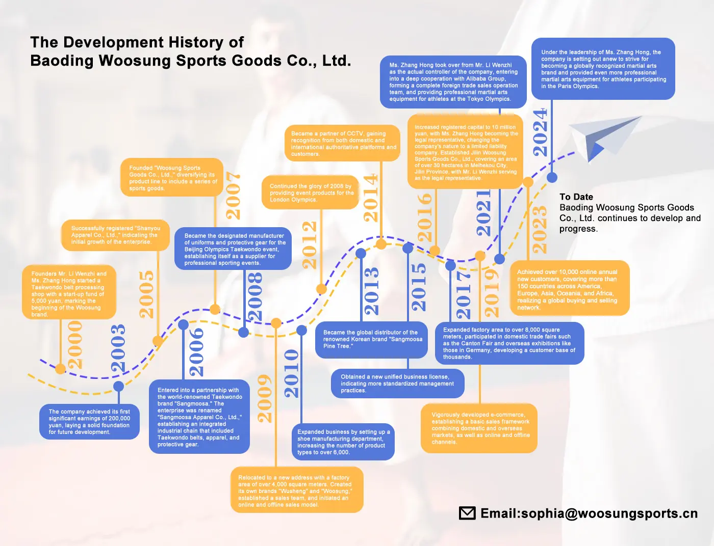 Em 2016, a Woosung Sports Goods aumentou seu capital registrado para 10 milhões de yuans, com Zhang Hong servindo como representante legal, transitando a empresa para uma entidade de responsabilidade limitada. Até 2017, a empresa expandiu sua área de fábrica para mais de 8.000 metros quadrados, participando de inúmeras feiras domésticas e internacionais, como a Canton Feira na China e feiras na Alemanha, desenvolvendo relacionamentos com mais de mil clientes.