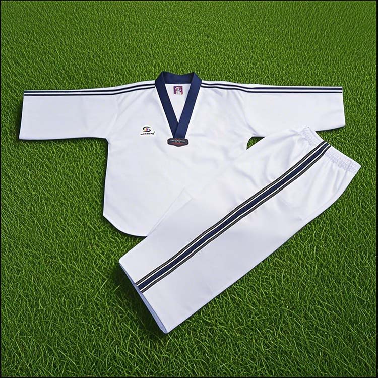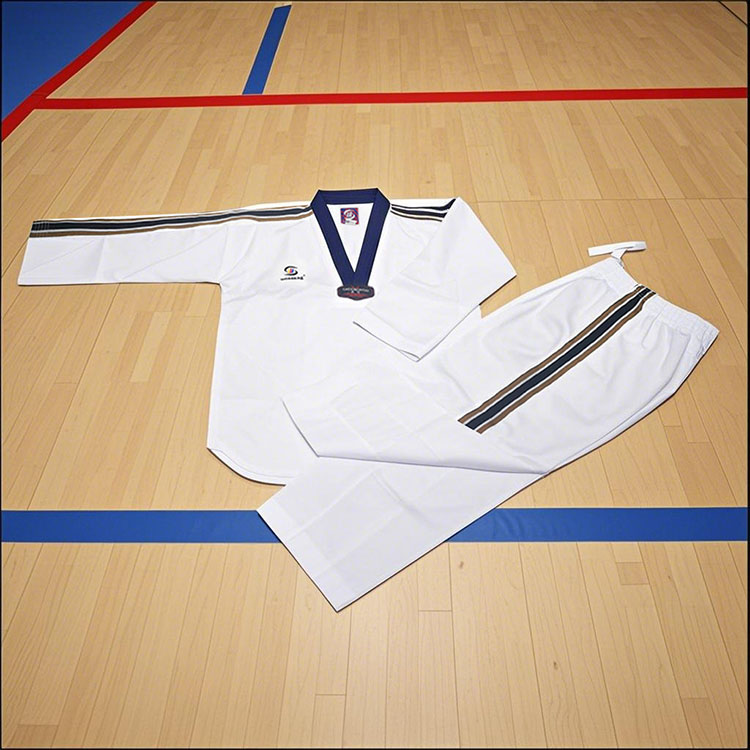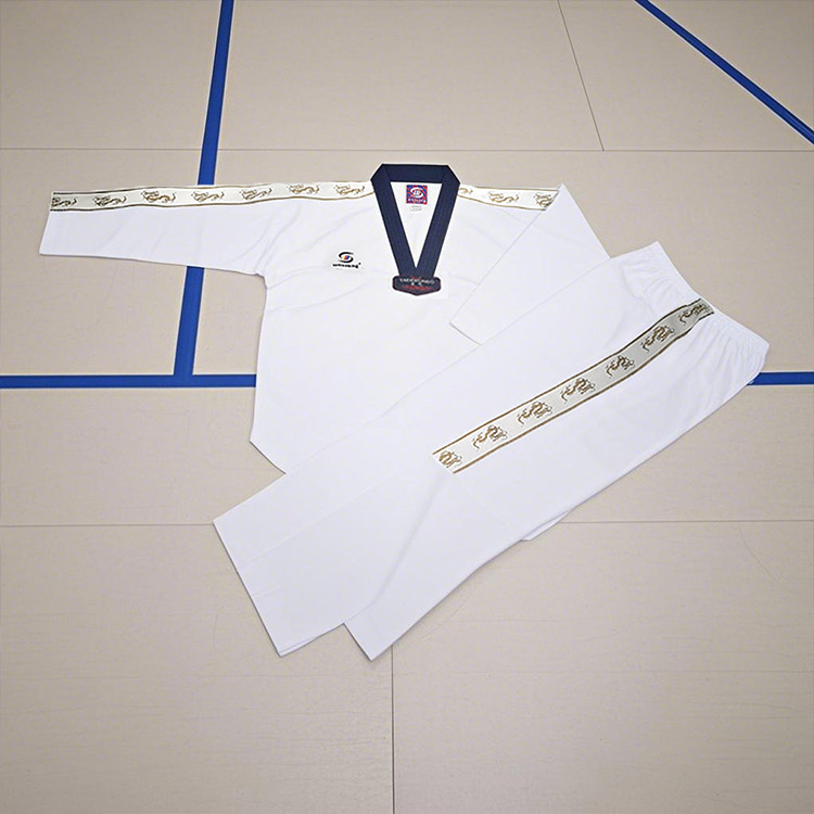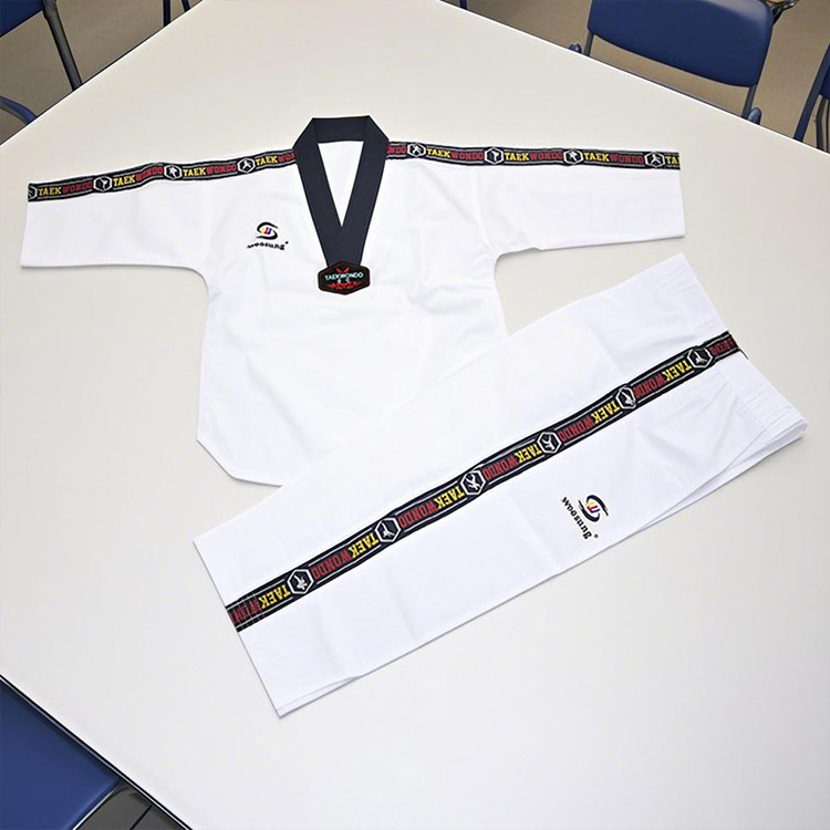 WOOSUNG é um fabricante profissional de vários uniformes de Taekwondo. Nossos uniformes listrados de Taekwondo são confeccionados em tecido de algodão respirável, com costura reforçada, cós com cordão nas calças e joelheiras, tornando-os duráveis, flexíveis e adequados para treinamentos e competições.